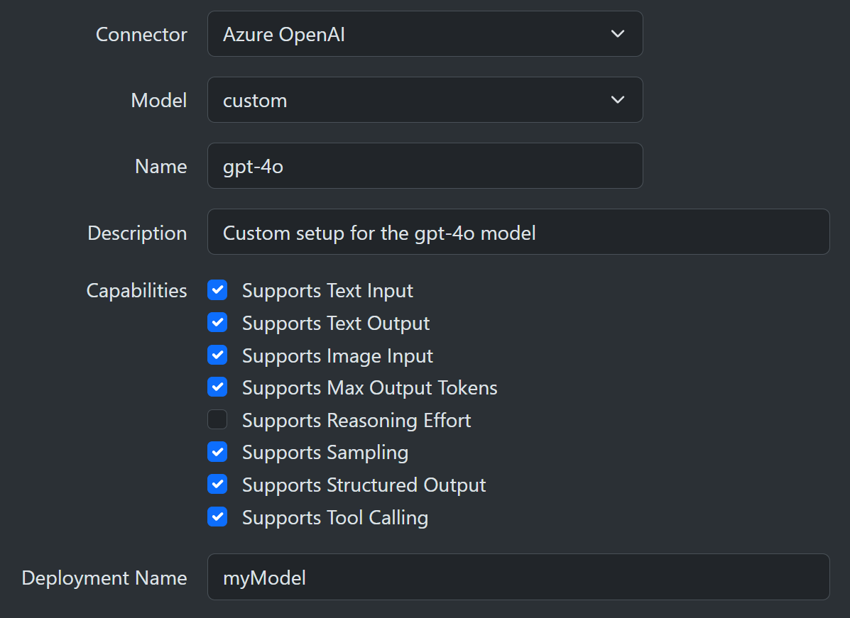 If the model you want to access is not listed, you can select the custom model. The custom option allows you to specify the model capabilities it supports. For example, reasoning, structured output, tool calling, image input, and so forth. You can look up this information online for the model of interest and then set up the model instance as needed. This customization mechanism allows you to call models that have been released since the last SharpOMatic update.