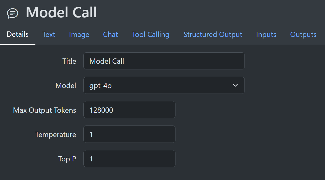Opening the ModelCall node details shows a drop-down that allows the user to select a model to call. You then get additional tabs that allow configuration based on the model capabilities. For example, if the model supports structured output, you get an extra tab for this feature. Inside that tab, you can define structured-output values that are used during the actual call.