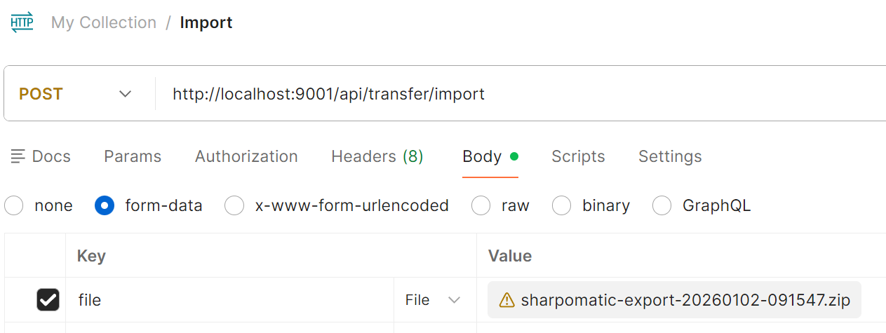 You must add the AddSharpOMaticTransfer call into your program setup for the transfer operations to work. If you forget this line then the editor will show the transfer option but all attempts to import or export will fail. In production you can add this transfer capability without the editor. You can then invoke the controller endpoints directly. For example, to import the latest versions of your workflows, models, assets etc.