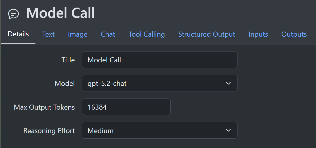 If no model is selected, the node fails at runtime. Once a model is selected, the defined model capabilities determine which tabs are available and the options within those tabs. It also presents extra fields on the details tab, depending on capabilities. For example, setting the maximum number of output tokens and the reasoning effort are common capabilities.