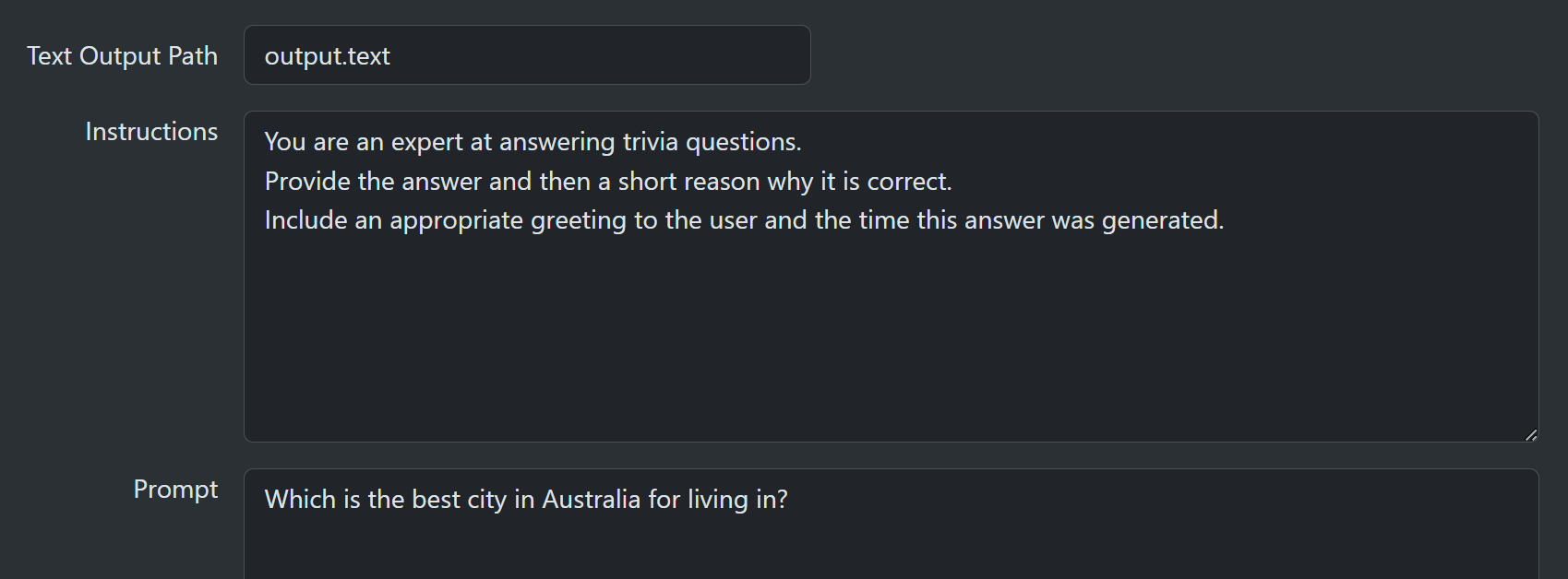 Text Output Path defaults to output.text and is the context path that receives text output from a successful model call. You can leave this field blank to ignore the output. Text output is still generated but discarded.