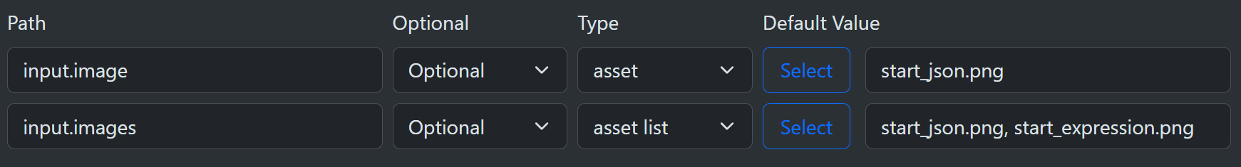 You can specify a single asset or a list of assets from the asset library. In both cases, these come only from the asset library and are the same each time you run the workflow. You cannot add run assets this way; add run assets programmatically by inserting them directly into the context.