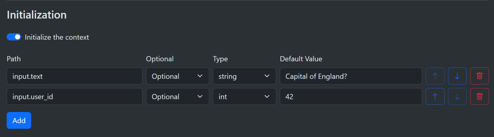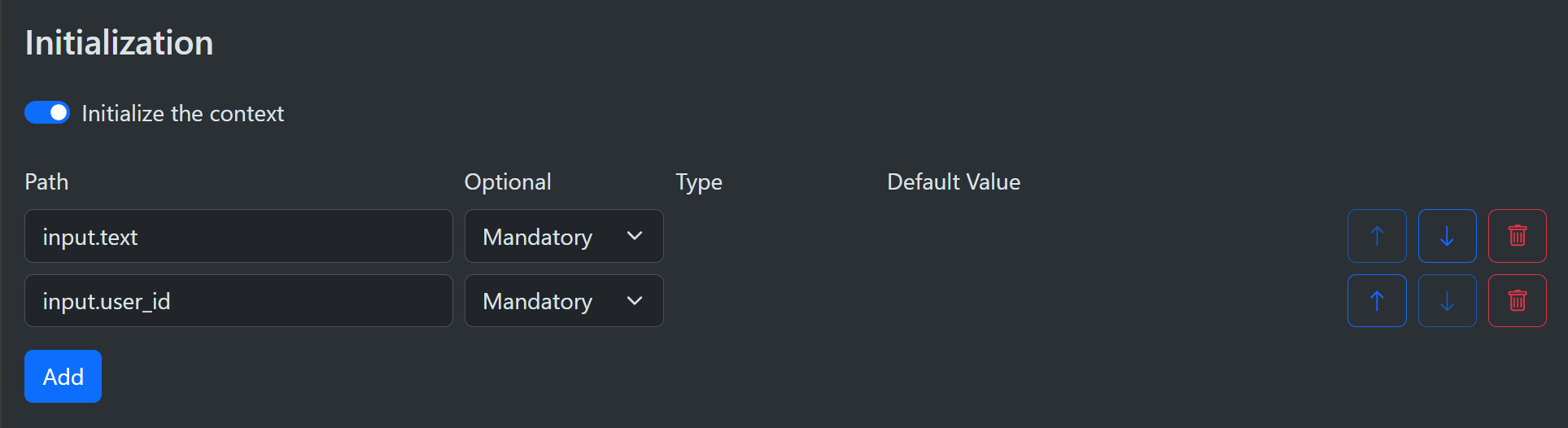You can choose to initialize the context. This allows you to enforce mandatory entries. Simply turn on the Initialize the context checkbox and then add a list of paths that must be present. Note that it does not check the type, only the presence of a value.