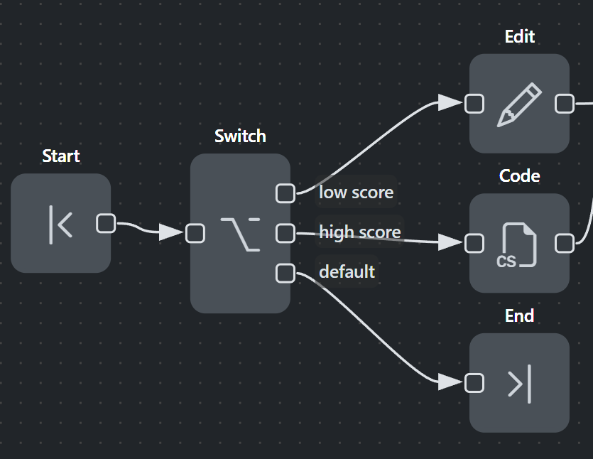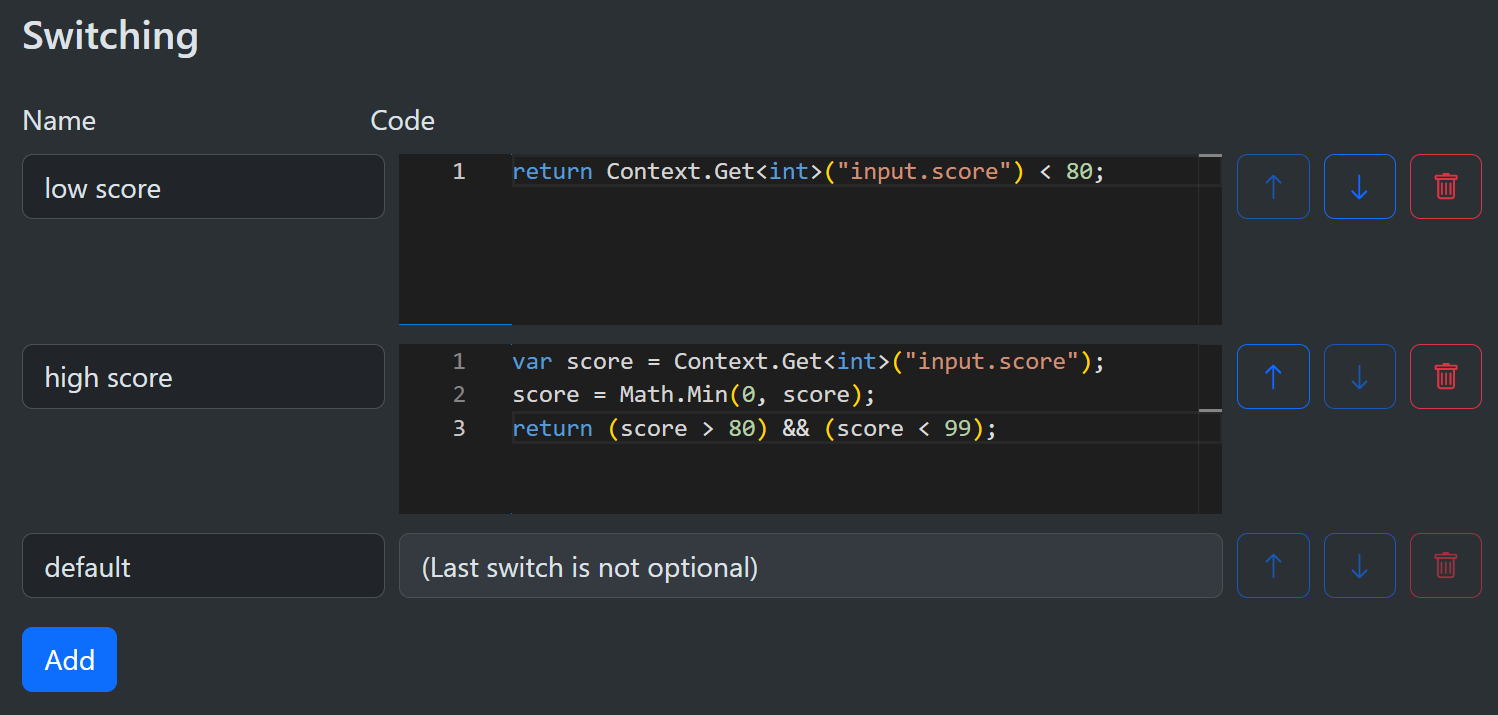 The last entry is the default branch. It has no expression, cannot be removed, and always runs if no earlier expression matches. This guarantees that the node always selects a path, even when all conditions are false. Each switch branch has a name so you can distinguish between them in the editor.